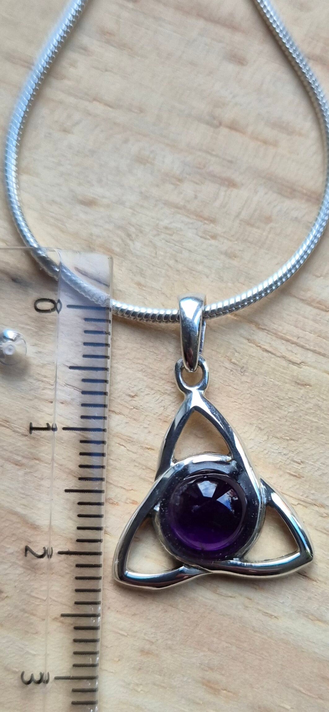 Echt zilveren hanger in de vorm van een Keltische Knoop (Triqueta). In het midden is een mooie ronde paarse Amethist edelsteen verwerkt.