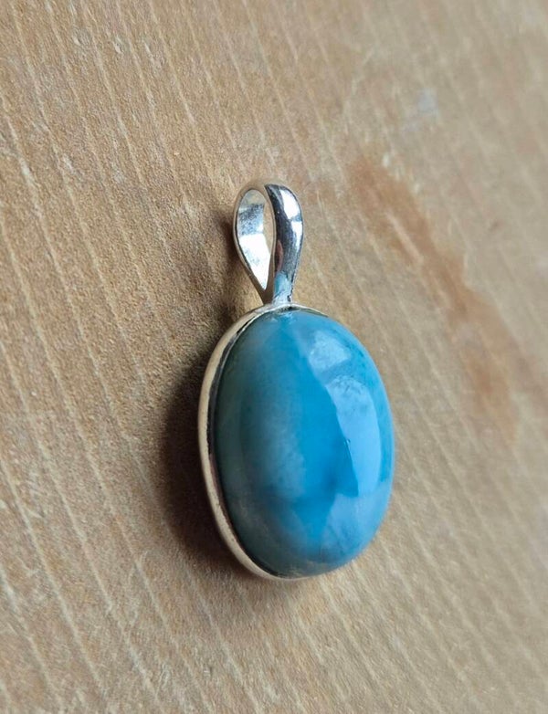 Een ovale hanger van ongeveer 2,5 cm lang. De omlijsting is echt zilver, erin een mooie lichtblauwe Larimar edelsteen.