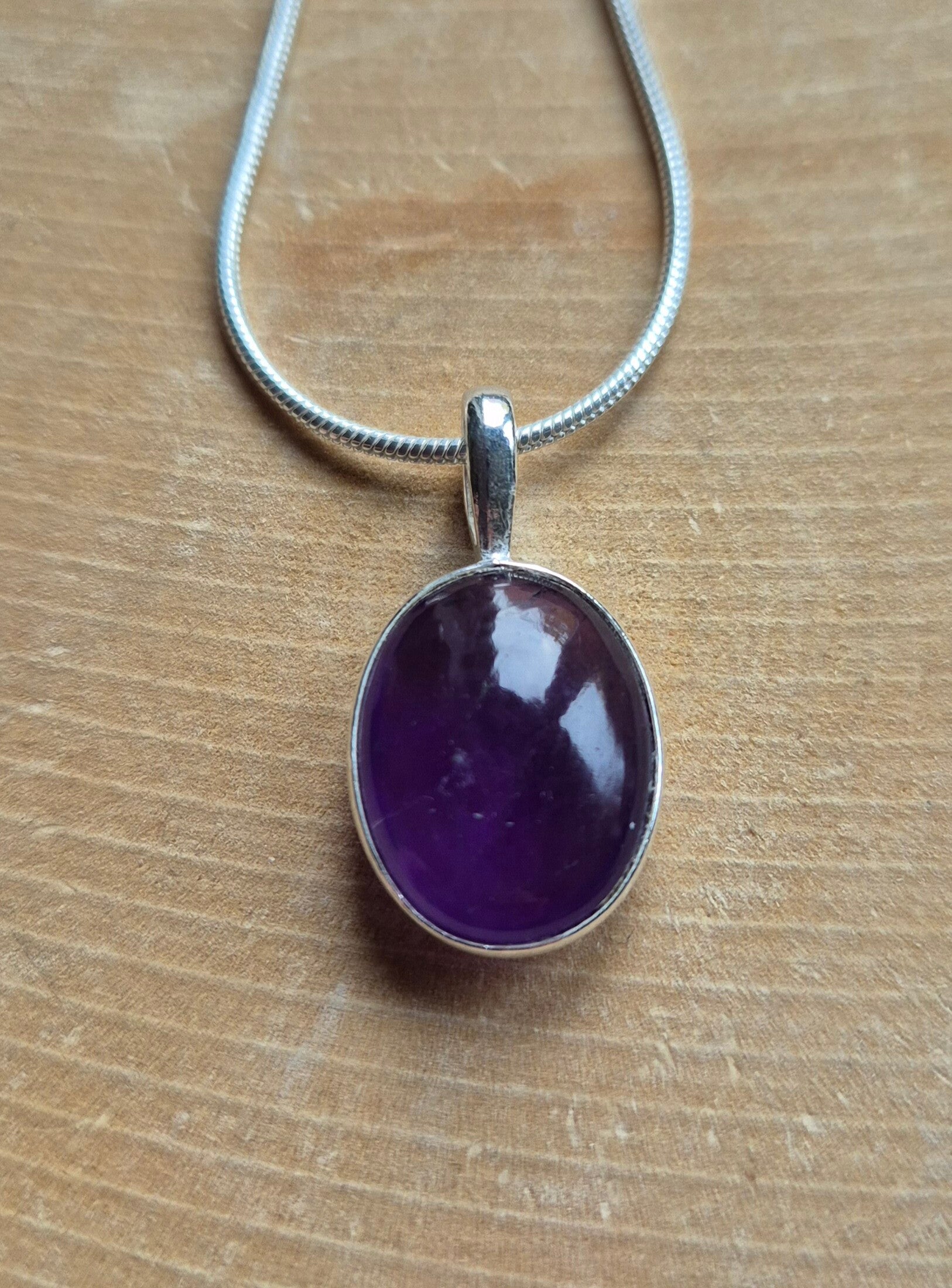 Een ovale kettinghanger van echt zilver met een paarse Amethist edelsteen. De hanger is zo'n 2,5 cm lang.