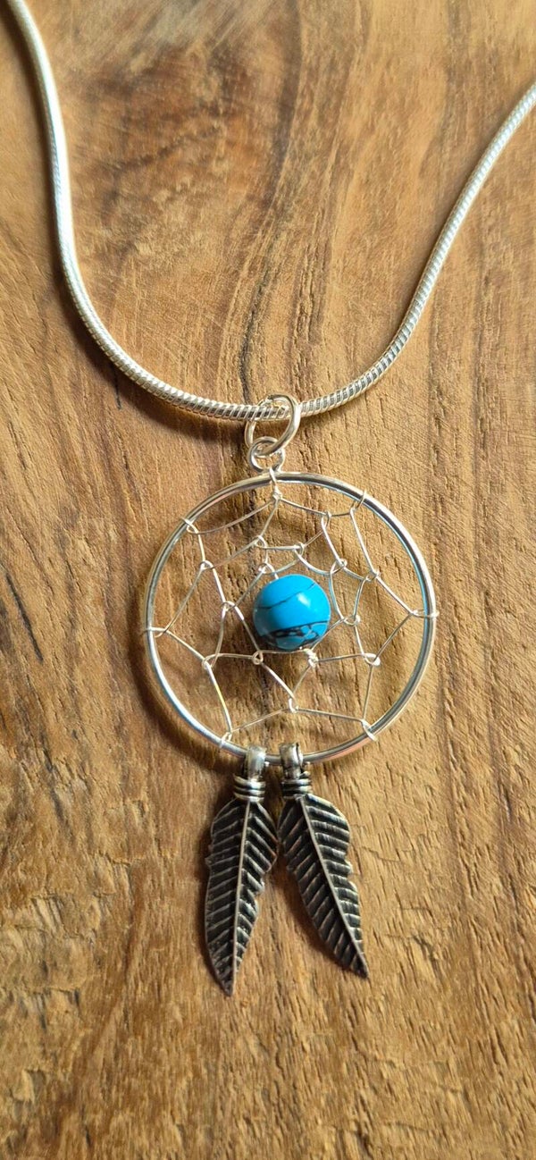 De afmeting van deze hanger Dromenvanger is 20x42 mm. Het is een echt zilveren hanger met een turkoois edelsteentje erin.