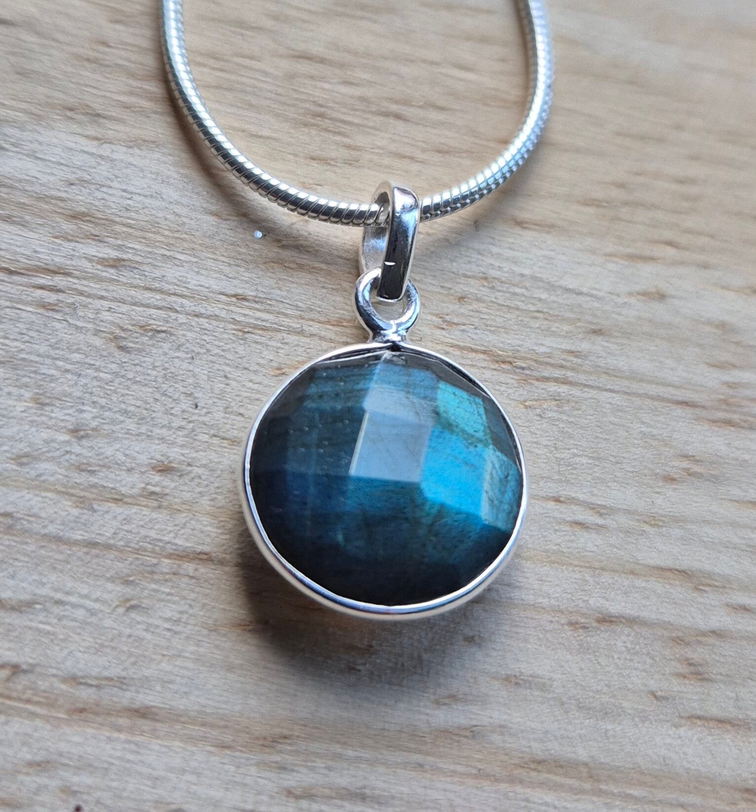 Ronde zilveren hanger met een facet geslepen Labradoriet edelsteen.