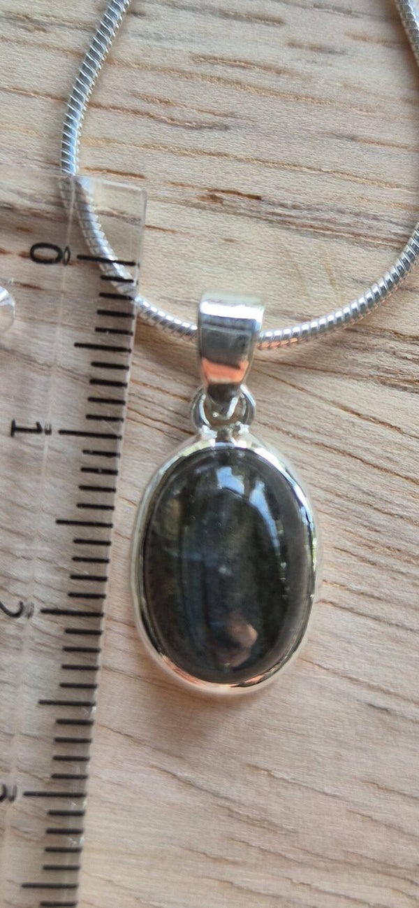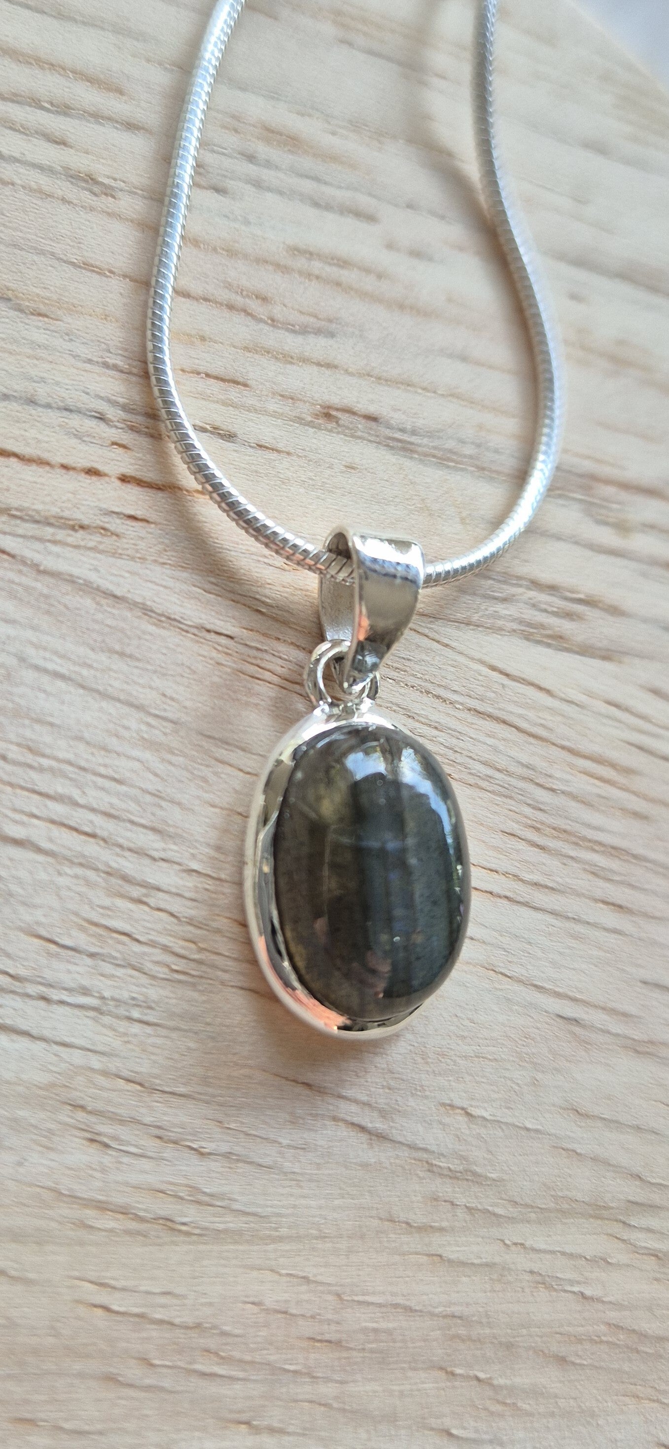 Mooie hanger van echt zilver met een cabuchon geslepen Labradoriet edelsteen. De hanger is ovaal van vorm en hij is 2,5 cm lang.
