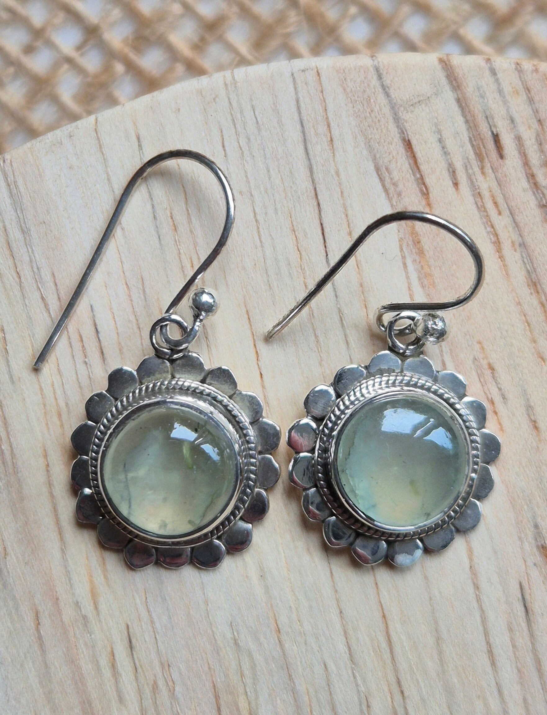 Grappige ècht zilveren 925 oorbellen met een flinke cabuchon geslepen lichtgroene Prehniet edelsteen.